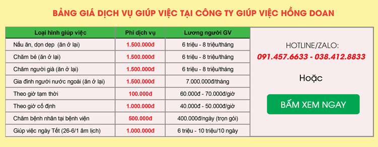 Bảng giá dịch vụ giúp việc Hồng Doan